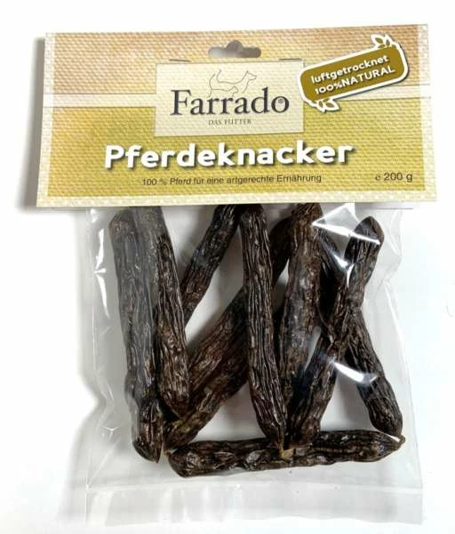 Farrado Pferdeknacker sind leckere Happen zur Belohnung aus nur einer ausgesuchten Fleischquelle (Monoprotein) ohne jeglicher Zusätze.