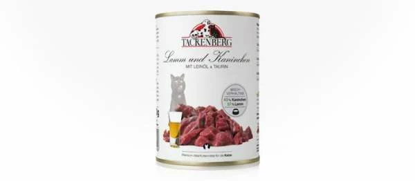 Tackenberg mit Lamm sowie Kanninchen sowie Leinöl und Taurin ist ein spezielles Katzenfutter (Nassfutter / Alleinfuttermittel) mit viel Fleisch.