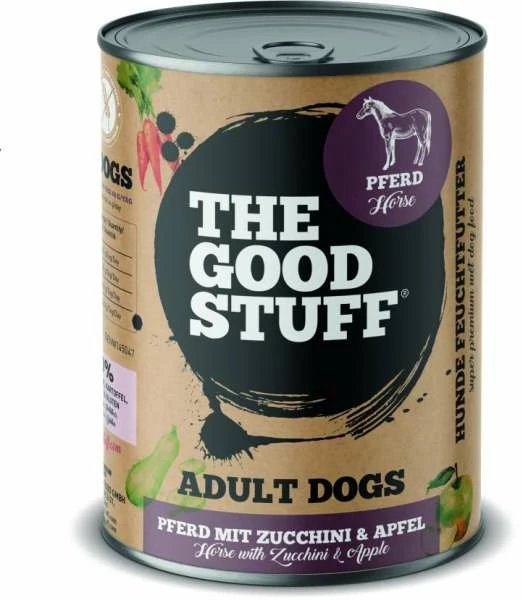 Frisches Pferdefleisch, -herz, -lunge, -magen, -leber (70%), Brühe (24,7%), Zucchini (2%), Karotten (2%), Apfel (0,5%), Mineralstoffe, Leinöl (0,2%), Bockshornklee, Löwenzahn, Flohsamen, Spinat, Rosmarin |