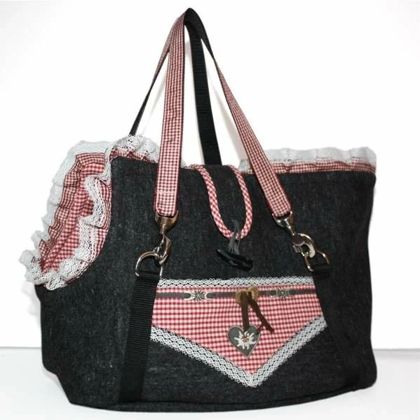 Die Hundetasche ist aus Wollfilz gearbeitet, der aus 100 % Schurwolle in Deutschland gefertigt wurde. Der beliebte Karostoff in rot/bordeaux ist in Handarbeit auf die Tasche genäht. Sportliche Motive im Alpen- und Jagddesign peppen die Kitzbühel zusätzlich auf. Am oberen Ende ist ein uraltes Spitzenband aufgenäht. Die Tasche ist nur auf einer Seite mit den aufwendigen Verzierungen versehen und die andere Seite ist dezent schlicht im Design gehalten (ideal auch für Ehemänner). Auf beiden Seiten ist eine Tasche aufgenäht, in der der Impfpass o.ä. verstaut werden kann.